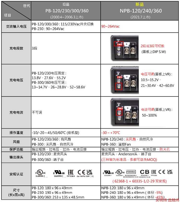 信息+家电类双安规、价格更具竞争力,非常适合电动自行车/机车、滑板车、独轮车、手持电动工具、移动机器人、无人搬运车、各种DC移动装置充电…等,为让使用者快速了解新旧世代差异,详请参考下表。