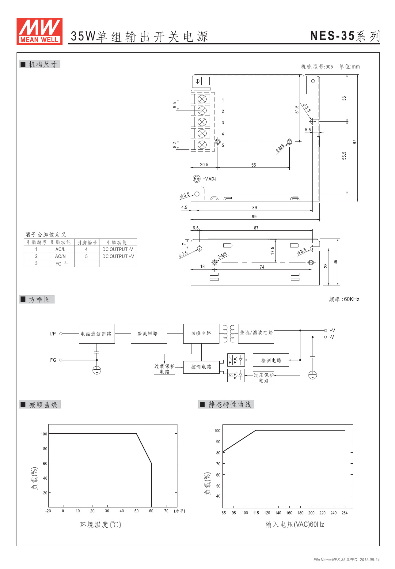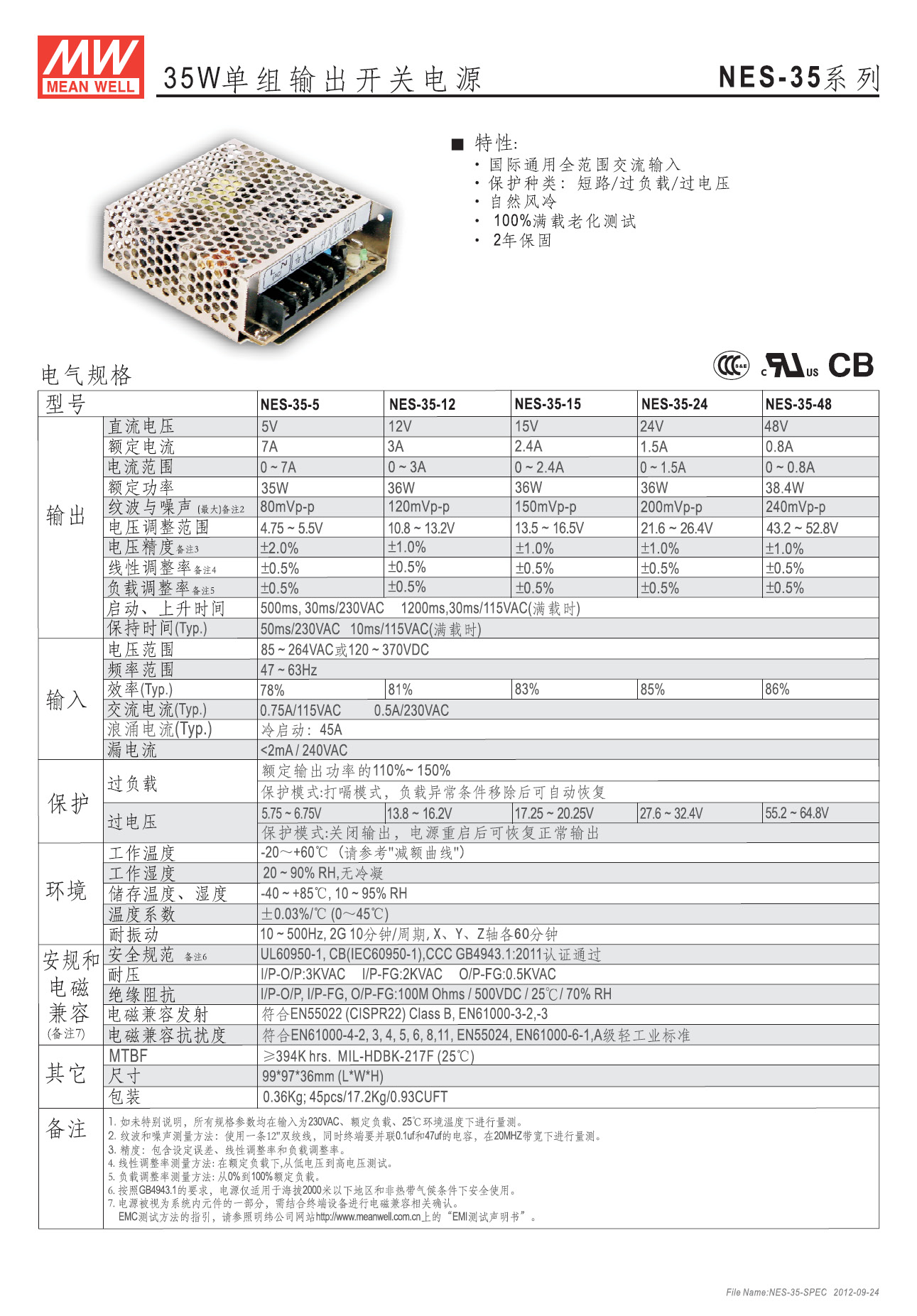 NES-35-48■ 主要特点全球通用全范围交流输入电压有短路保护/过载保护/过电压保护通过国际安规认证UL/CB/CCC通过中国国家安规认证 CCC认证自然通风冷却小尺寸、高功率密度高性价比、高可靠100%满载老化测试有安规认证的低功率电源解决方案台湾明纬品牌,广州工厂生产2年质保