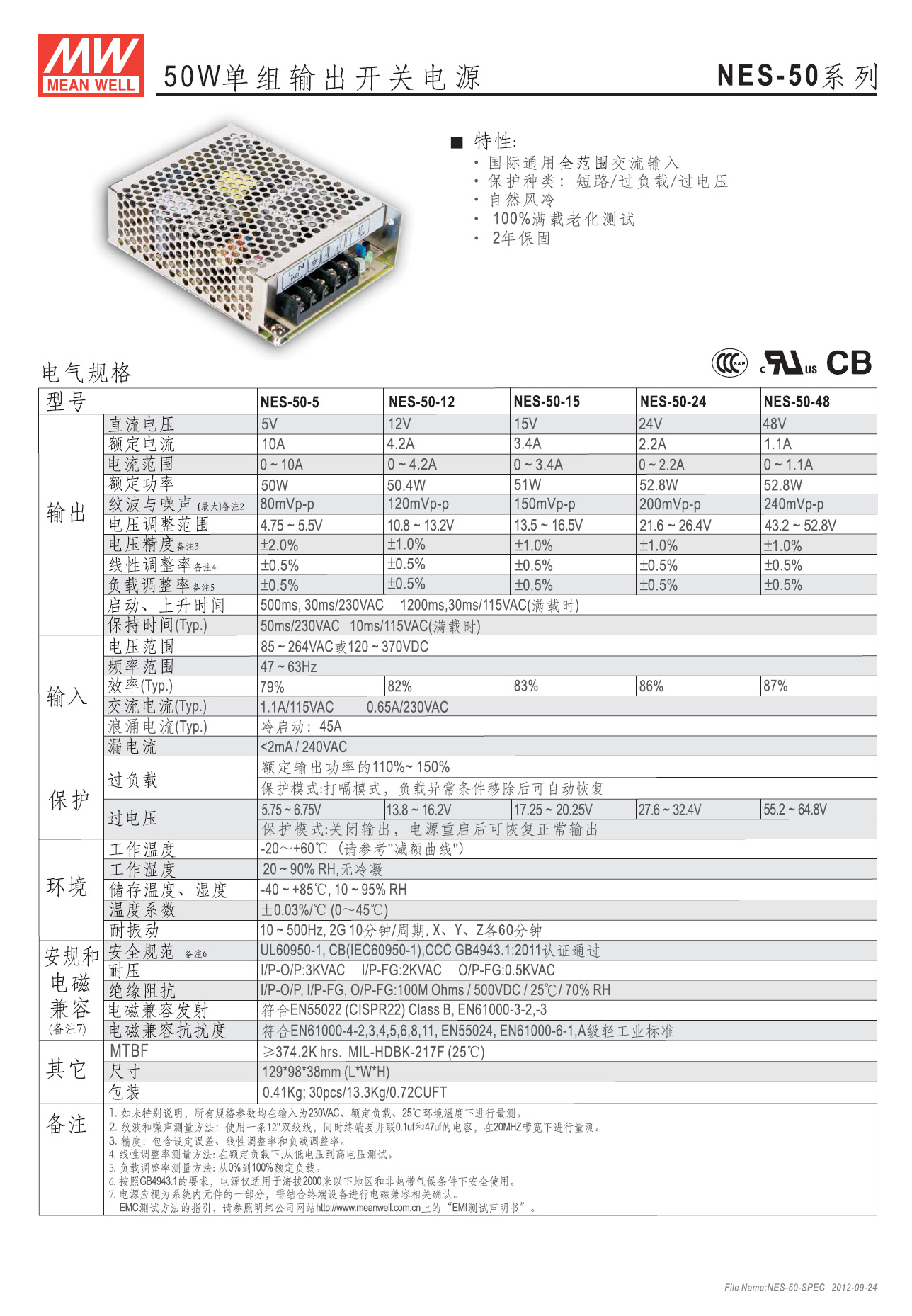 NES-50-48 ■ 主要特点全球通用全范围交流输入电压有短路保护/过载保护/过电压保护通过国际安规认证UL/CB/CCC通过中国国家安规认证 CCC认证自然通风冷却小尺寸、高功率密度高性价比、高可靠100%满载老化测试有安规认证的低功率电源解决方案台湾明纬品牌,广州工厂生产2年质保