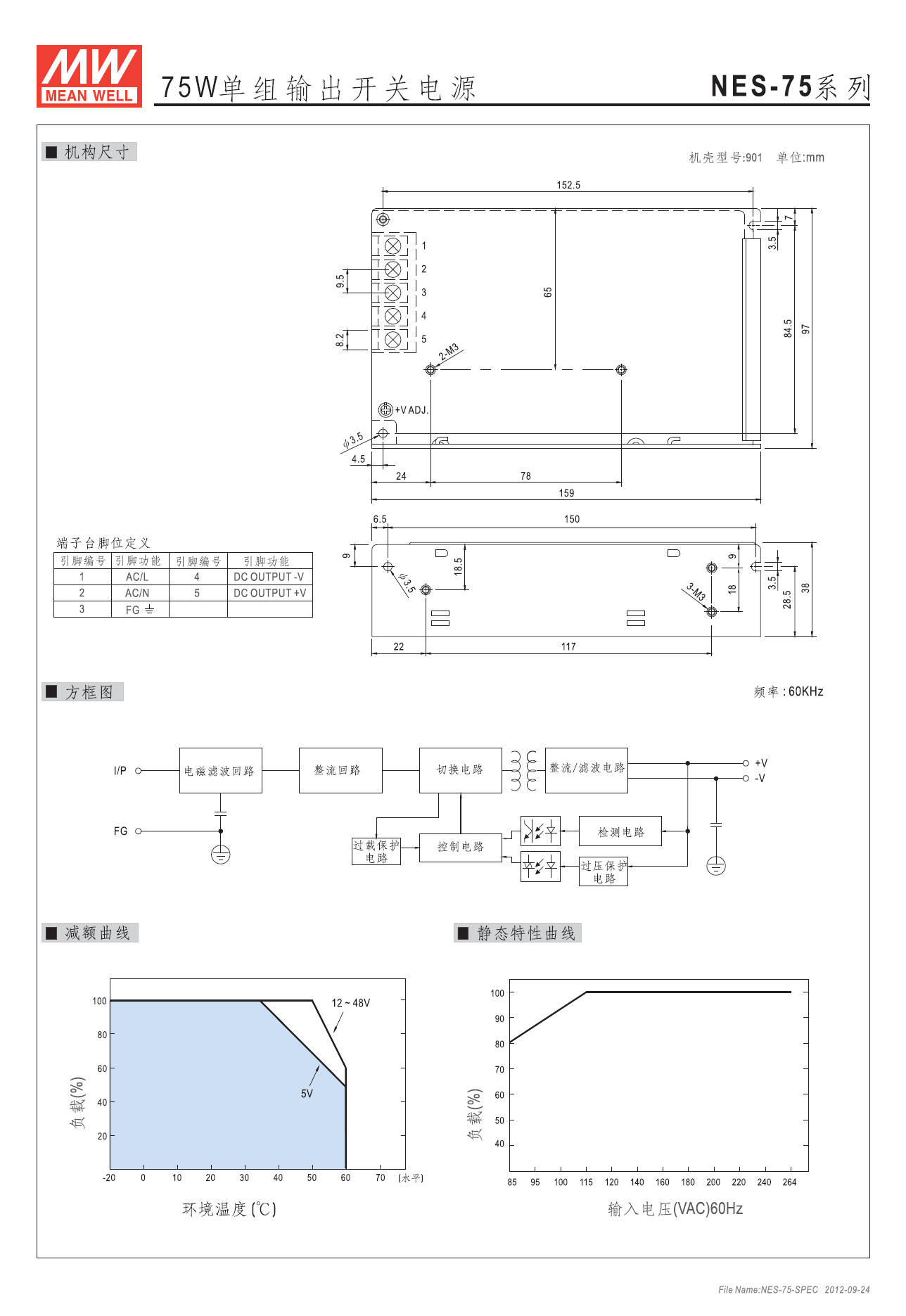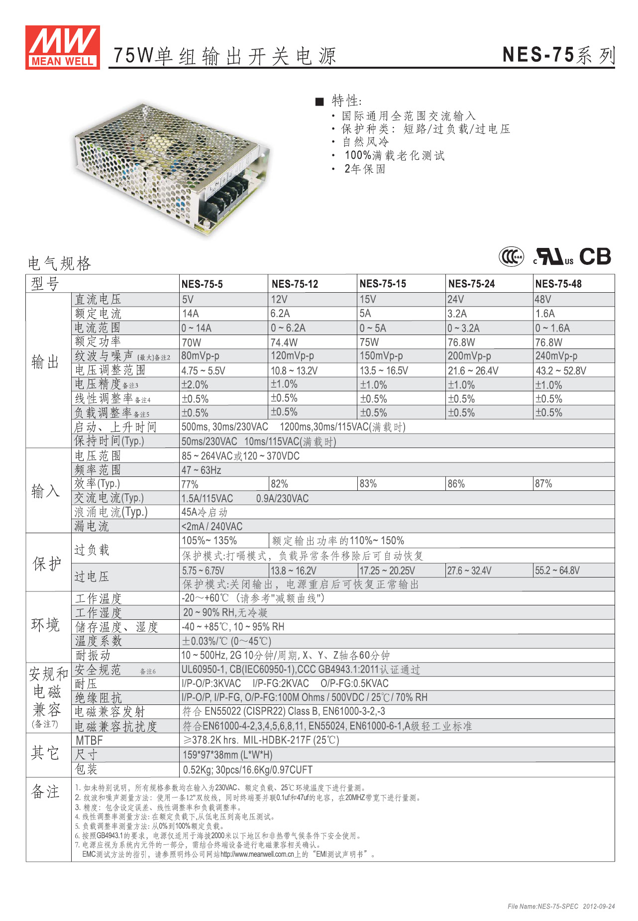 NES-75-48 ■ 主要特点全球通用全范围交流输入电压有短路保护/过载保护/过电压保护通过国际安规认证UL/CB/CCC通过中国国家安规认证 CCC认证自然通风冷却小尺寸、高功率密度高性价比、高可靠100%满载老化测试有安规认证的低功率电源解决方案台湾明纬品牌,广州工厂生产2年质保